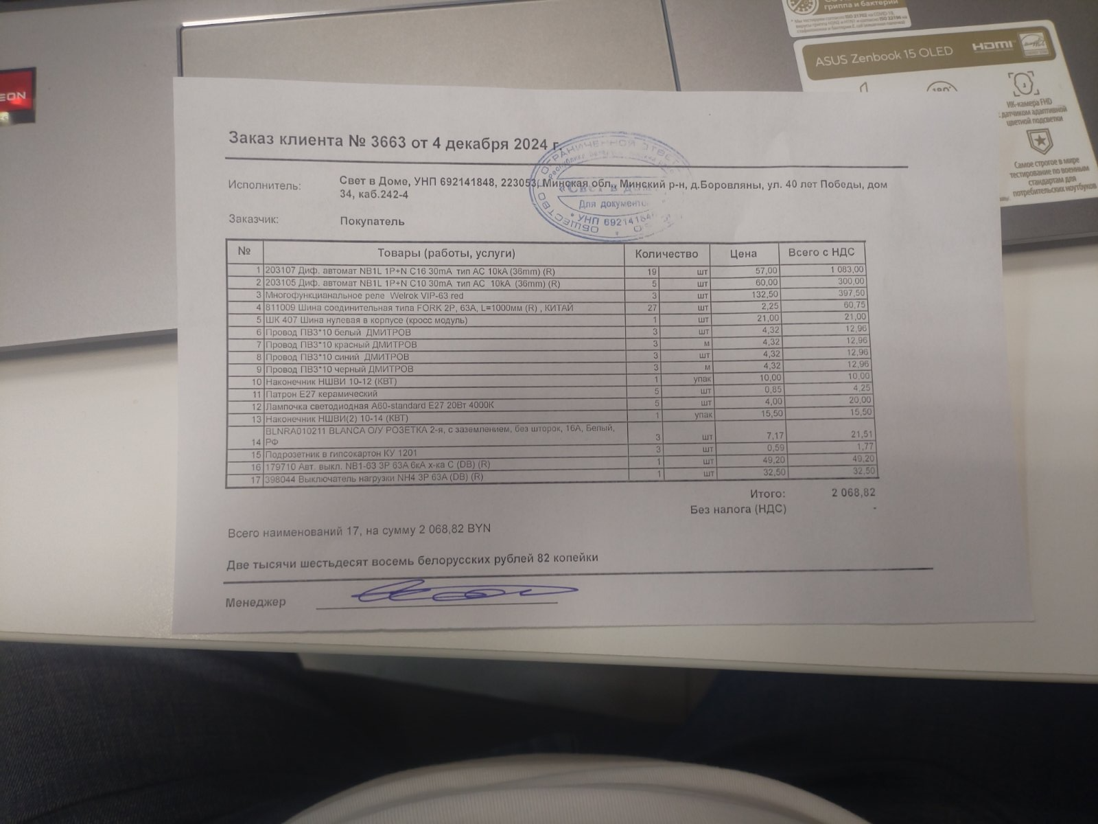 Нужны чеки и накладные по электрике. Обязательно с указанием моих данных. Также есть те, которые нужно переделать (заказ 3663 от 4 декабря 2024).